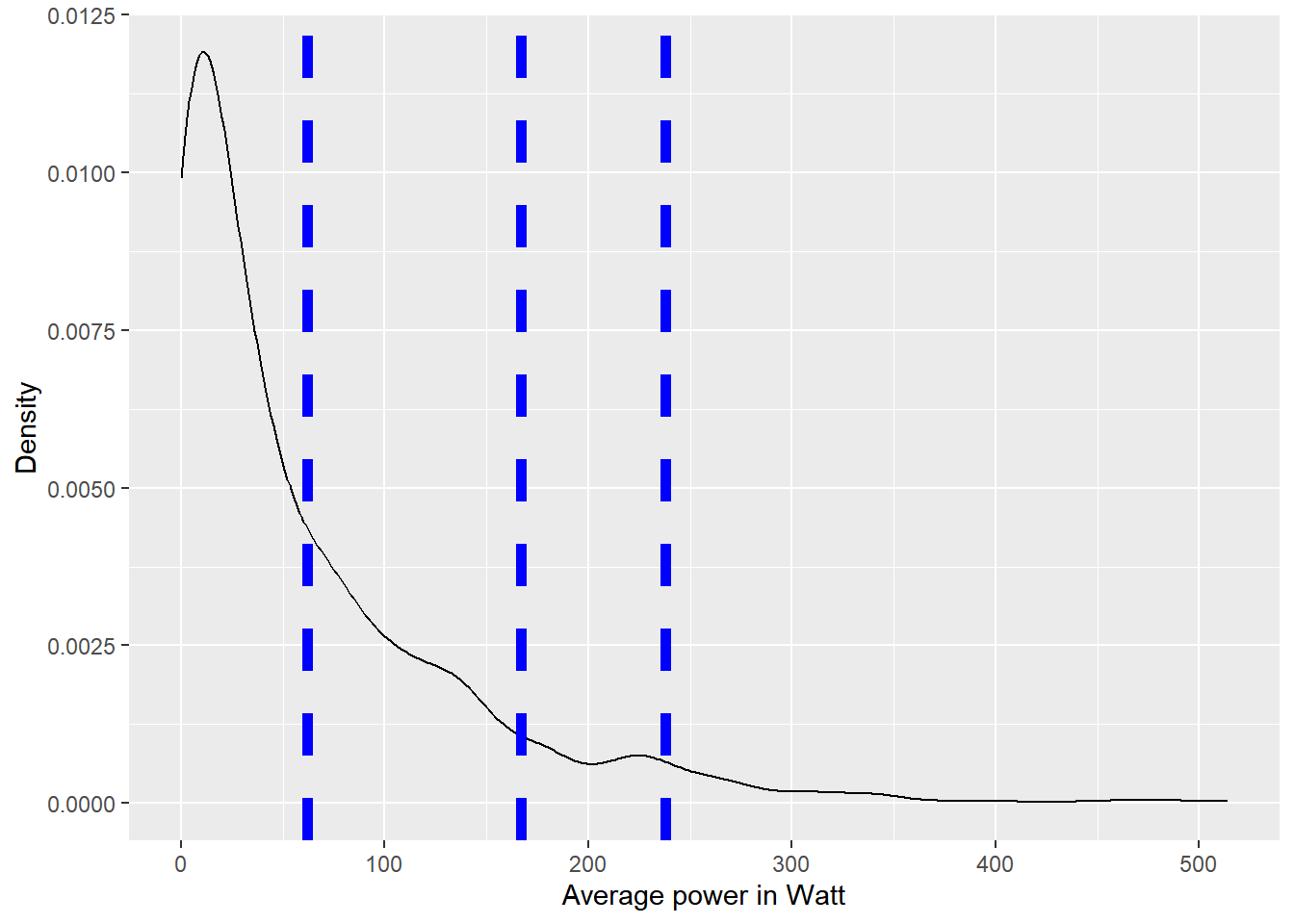 This shows considerable heterogeneity. All users use on average 62 Watt. The top 25 percent of users however use 167 Watt. Hence, if we succeed in targeting those users we could double the capacity of our virtual power plant without necessarily exerting more effort. The top 10 percent of users use on average 238 Watt; i.e. focusing on those users would more than quadrouple capacity.