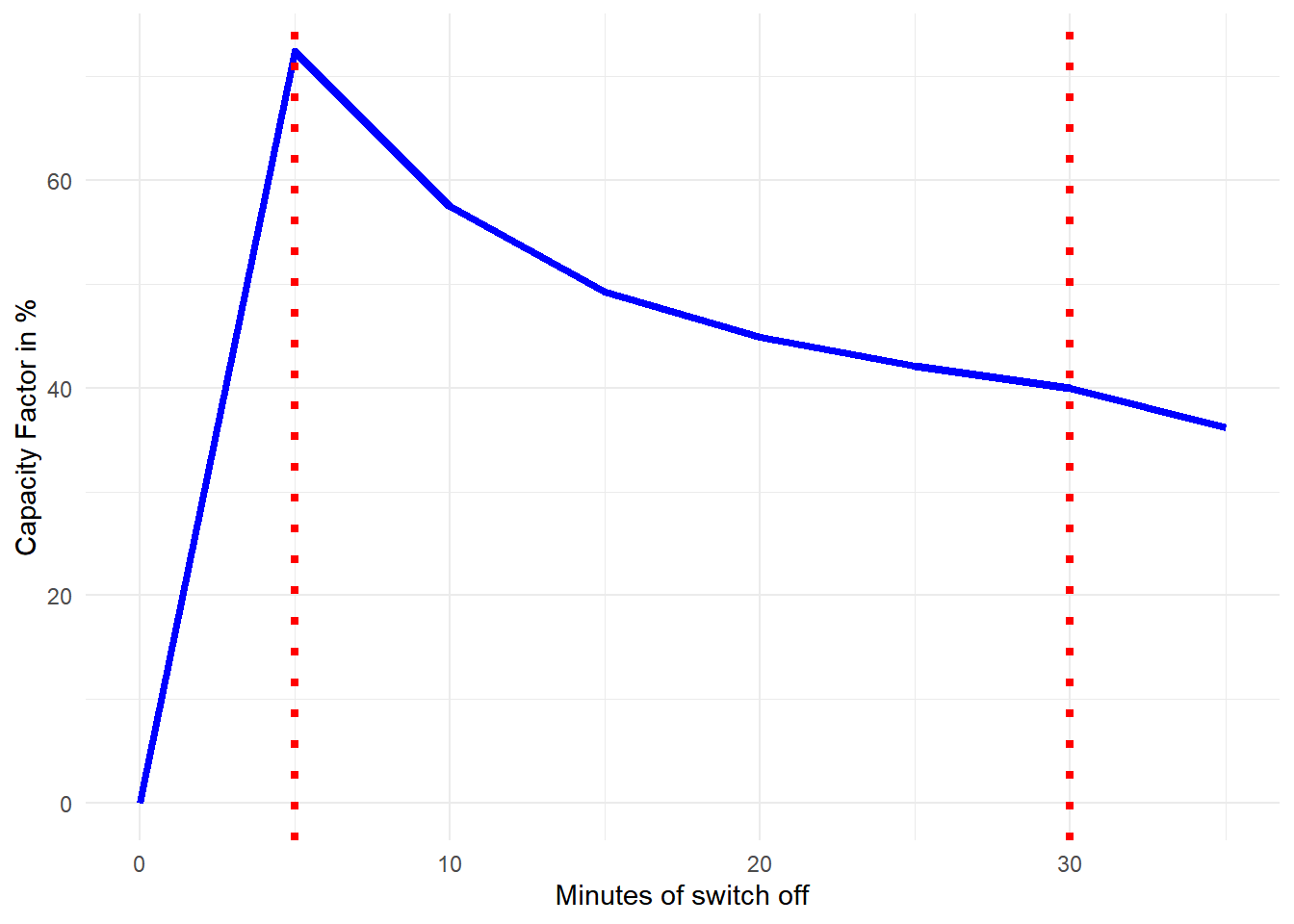 Note that even after the end of the switch off event, devices do not - on average - return to pre switch-off event consumption levels. Note that even after the end of the switch off event (i.e. after minute 30) our virtual power plant provides power (as shown by a positive capacity factor). This reflects that some devices remain off but even those that turn back on typically do not compensate for the switch off period.