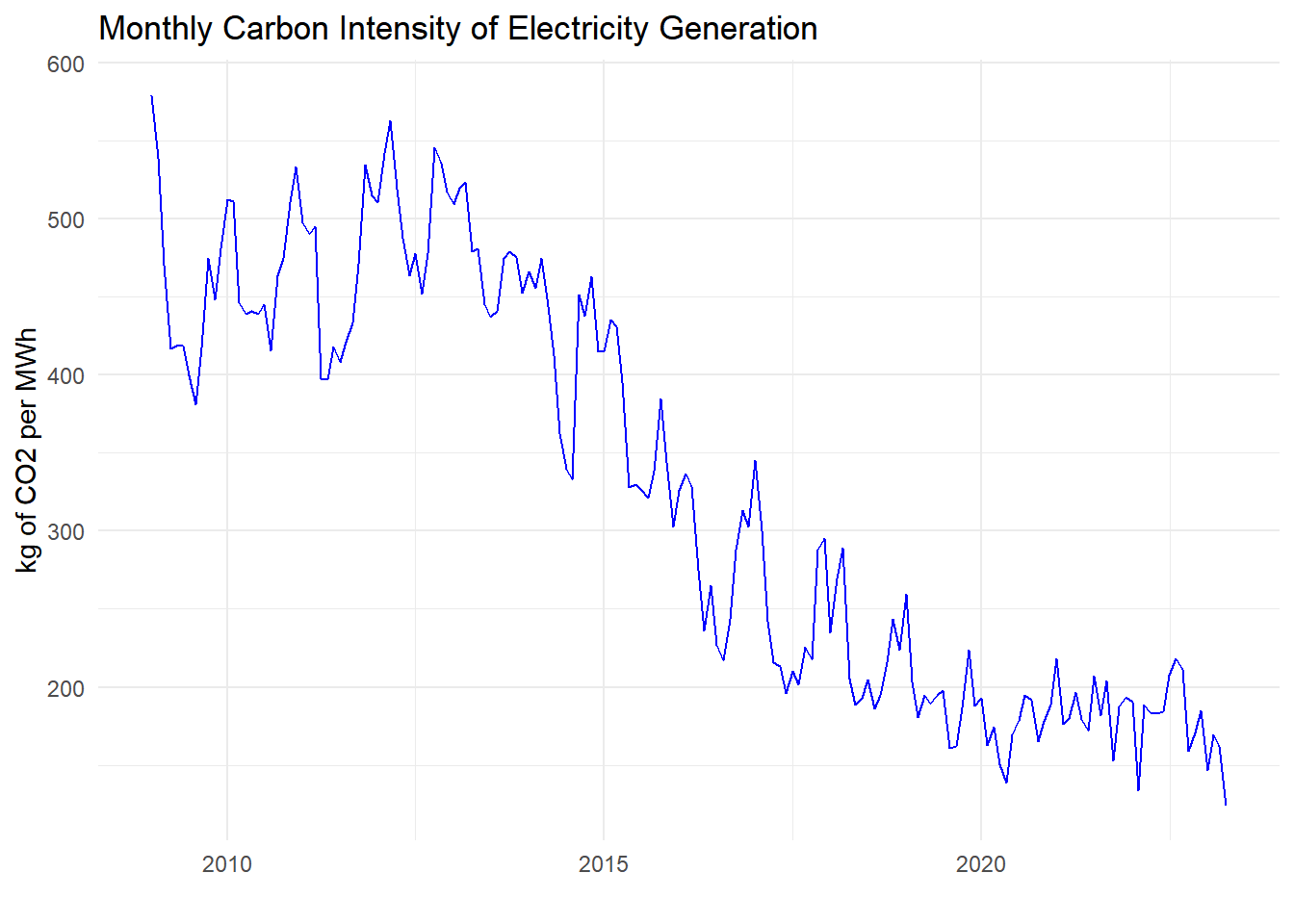 The carbon intensity of UK electricity generation has dramatically reduced in recent years primarily due to an ever larger share of renewable energy generation.