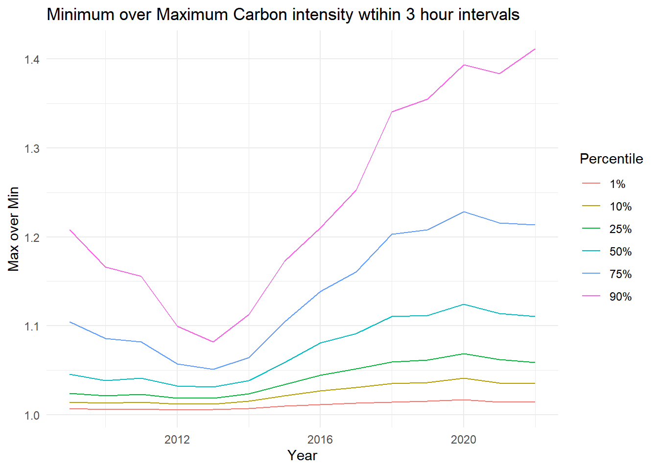 For instance, in 2009 (at the beginning of our sample period) the ratio between maximum and minimum carbon intensity was less than 1.1 in 75% of all 3 hour periods. By 2020 this 75% quatnile has risen to 1.2 implying in turn that there was a more than 20% difference in 25% of 3 hour periods. In 10% of 3 hour periods there was indeed a more than 40% difference.