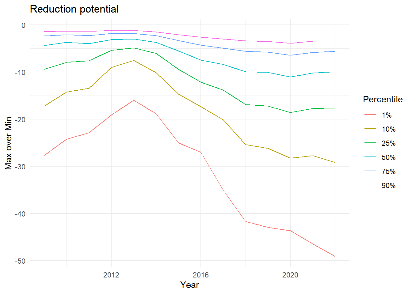 Hence, the Figure shows for instance that in 2009, in 25% of 3 hour periods consuming a kWh of electricity at the least polluting time point in that 3 hour period would be at least 10% less polluting than consuming at the most polluting time point. In 2022 it would be 20% less polluting. In 10% of case it be 30% (or more) less polluting.